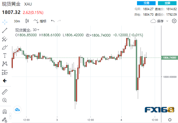 数据公布后,现货黄金短线一度急跌超20美元至1792.09美元低点,但随后有所回升,现交投于1807元一线。