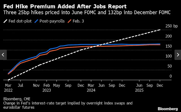 FX168财经报社(北美)讯 周五(2月4日),交易员们加大了对美联储将以20年来最大幅度加息的押注,此前一份出人意料的强劲就业报告强化了人们对经济存在过热风险的猜测。