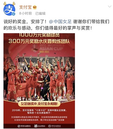 据支付宝官方微博,在超级逆转夺冠后,中国女足收到冠军奖金!支付宝兑现承诺,官宣给女足1300万奖金,其中1000万奖励球队,300万给水庆霞教练团队,姑娘们值得!