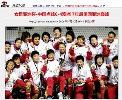 2006年7月,女足战胜东道主澳大利亚夺冠,一开始是从0:2落后,最后也实现惊天大逆转,并通过点球夺冠。