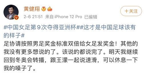 中国女足勇夺亚洲杯冠军后,知名解说黄健翔发博称:“足协请按照男足奖金标准双倍给女足发奖金!其他的我没有更多想说的了。该说的都说完了。明天我继续回到冬奥会转播,跟王濛一起说速滑,可以休息一下我的嗓子了。”