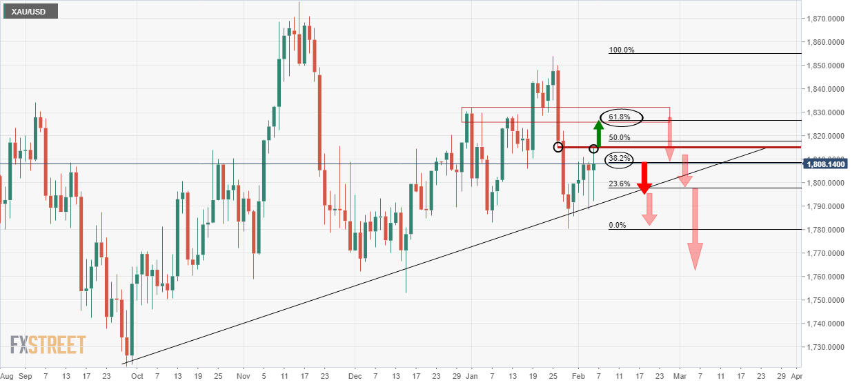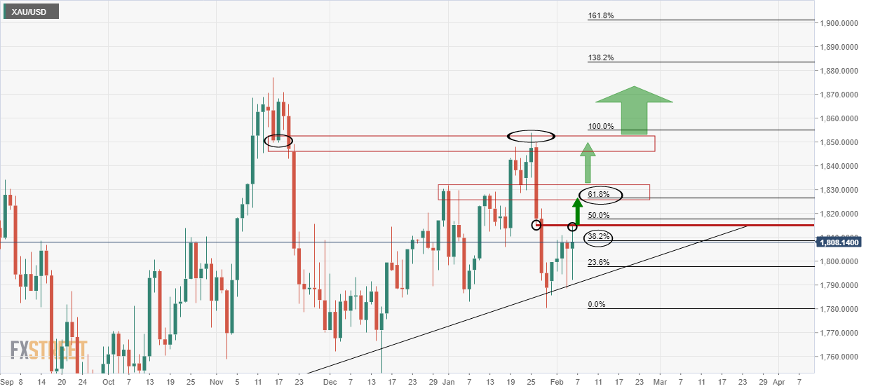 FXStreet展望后市提出技术分析称,黄金本周多头采用38.2%的斐波那契,现在关注61.8%的黄金比例。在联动分析中,解释说“直到M型的颈线被打破,重点是下行。”