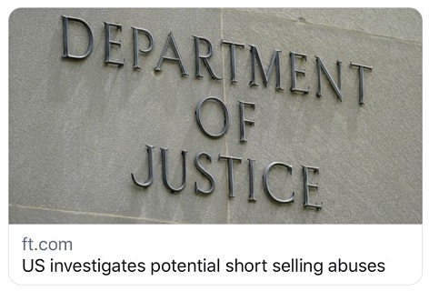 美国司法部称,这项调查是因为接到来自投资者的投诉越来越多,这些投诉要求政府调查卖空者的阴谋。