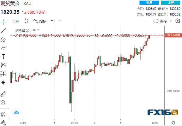 美市盘中,现货金延续涨势并刷新日高至1820.89美元,较日低拉升了超14美元。