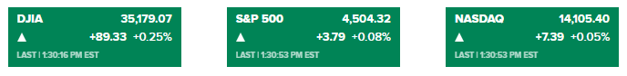 目前,三大股指悉数转涨:道琼斯指数现上涨近90点,涨幅约为0.25%。标普500指数上涨0.08%,纳斯达克综合指数微幅上涨0.05%。