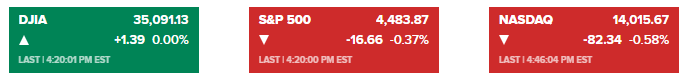 以科技股为主的纳斯达克综合指数收盘下跌0.58%,至14015.67点;标普500指数下跌0.37%,至4483.87点;道琼斯指数微幅上涨1.39点,报35091.11点。主要股指盘中大部分时间在涨和跌之间交替,最后一小时加速回落。