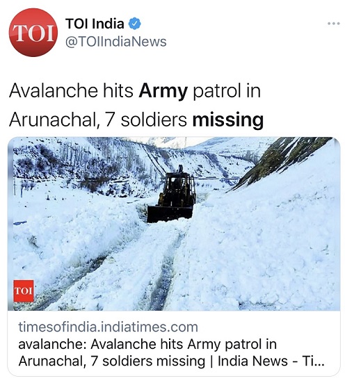 FX168财经报社(香港)讯 印度7名军队人员日前在中印边境地区巡逻期间遭遇雪崩袭击,目前下落不明。此前印度陆军方面也曾发生此类事件,有巡逻人员因雪崩丧生。