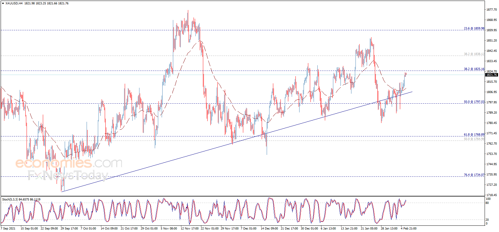 Economies.com称,因此,我们将继续预测金价在未来一段时间处于看涨趋势。需要考虑到的是,若金价未能突破1825.15美元/盎司,这将迫使金价回落并再度测试1797.00美元/盎司区域,然后重新尝试反弹。