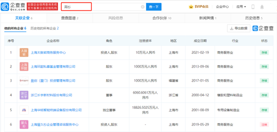 当前高杉关联企业共有6家,并在其中担任投资人、董事等职务,其中一家已注销。