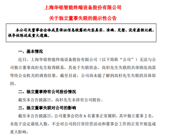 高杉担任独立董事的上海华铭智能终端设备股份有限公司也公告称,无法与其取得联系,原因不详。