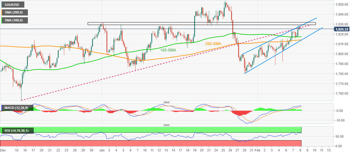 24K99讯 周三(2月9日)亚市盘中,现货黄金维持升势,目前交投在1827美元/盎司附近。知名财经网站FXStreet分析师Anil Panchal周三撰文,对金价技术前景进行分析。Panchal指出,假如攻克关键阻力区域1829-32美元/盎司,金价有望迎来进一步大涨。