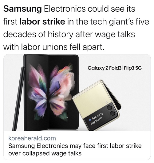 若工人举行大罢工,这将导致三星从半导体芯片到电子产品和家用电器的业务暂停。