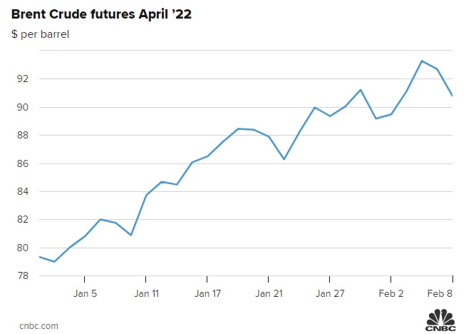 布伦特4月交割的原油合约周三小幅走低,至90.50美元/桶左右,但油价自年初以来一直稳步上涨,当时的交易价在80美元/桶以下。