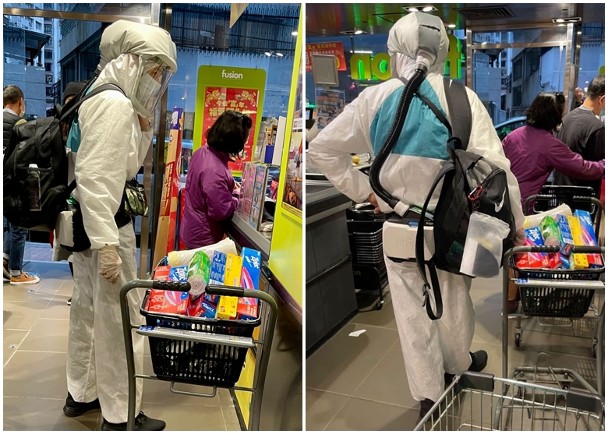 有网民周四在社交平台推特上贴出2张照片,可见相中人正身处一间“fusion”超市,并身穿相当高规格的全包式防护装备,在附有透明挡板的头罩下更戴有口罩,双手亦戴有相信是即弃医疗用手套,腰间更绑有疑似提供新鲜空气的便携式呼吸机器,并有条喉管连接头罩后方。
