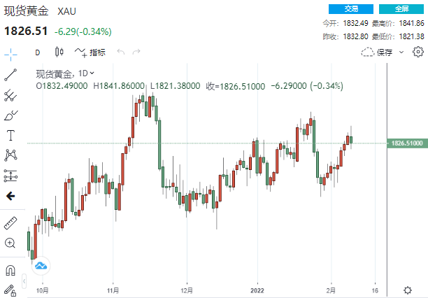美市尾盘,现货黄金收报1826.51美元/盎司,下跌6.29美元或0.34%,日内最高触及1841.86美元/盎司,最低触及1821.38美元/盎司。