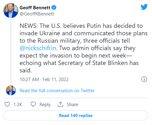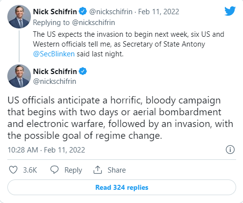 他在推特上写道:“两名行政官员表示,他们预计入侵将于下周开始,这与美国国务卿布林肯的说法相呼应。”