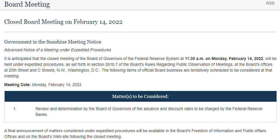 一个是下周一美联储的“情人节会议”。在CPI数据公布后,美联储网站上一则会议通知吸引了市场关注。通知预告了当地时间下周一(2月14日)上午11:30的一场非公开会议,会议内容将围绕美联储理事会审查和决定联邦储备银行的预付利率和贴现率展开。