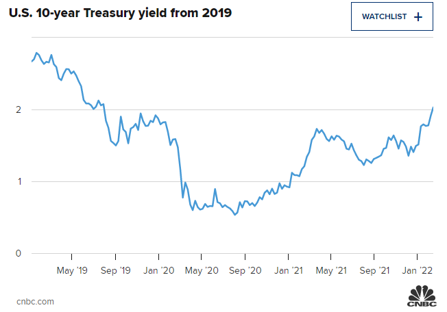 当债券被抛售时,收益率就会上升,其在过去的一周内大幅上升。10年期国债收益率周五曾高达2.06%。乌克兰消息传出后,10年期国债收益率回落至1.93%左右。