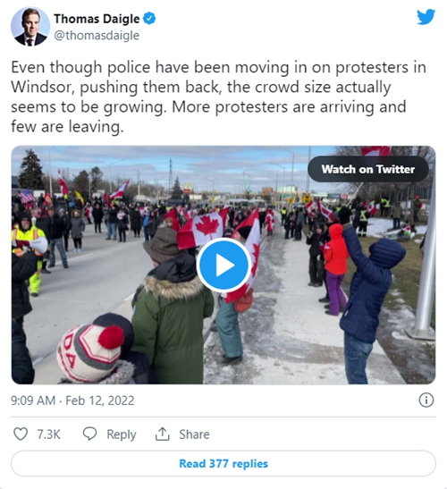 FX168财经报社(北美)讯 周六(2月12日),警方开始驱散在温莎大使桥举行的长达一天的抗议活动,抗议人群继续增加,皮卡车仍在继续抗议。在通往美国的关键边境通道上,车辆一直在阻塞交通。