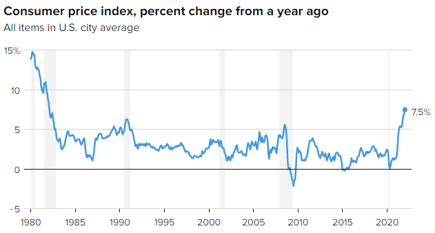 美国劳工部周四公布,1月份消费者价格指数较上年同期增长7.5%,高于预期的7.3%和前值的7%,为1982年2月以来的最高水平。该指数衡量的是数十种日常消费品的成本。在过去11个月中,CPI有9个月超过了华尔街的预期,这也是该数据连续第20个月环比上涨。