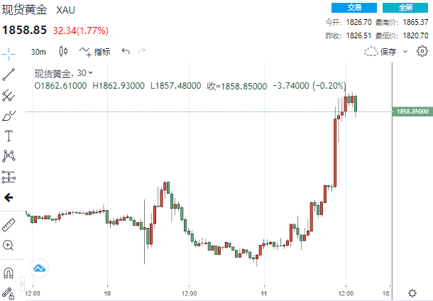 消息传出后,现货黄金短线迅速拉升至1865.37美元/盎司高点,较日低大幅反弹近35美元,尾盘收报1858.85美元/盎司,大幅上涨32.34美元或1.77%。
