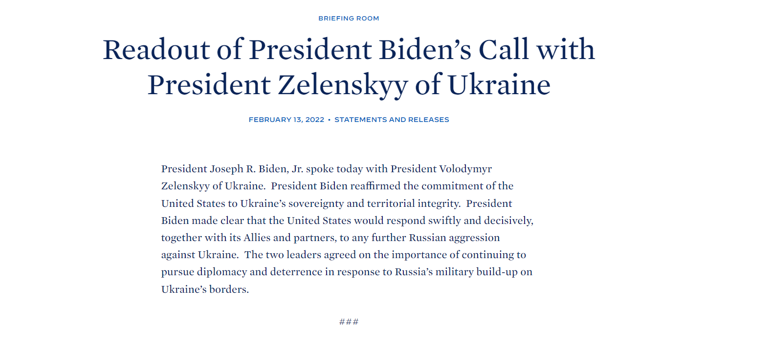 根据一份两人电话会谈的纪录:“两位元首同意,因应俄罗斯在乌克兰边界增兵,持续致力于外交斡旋与吓阻的重要性。”白宫另指出:“拜登重申美国对乌克兰主权与领土完整的承诺。”这是指每当谈到俄罗斯的边缘政策,美国总统多次表达的立场。