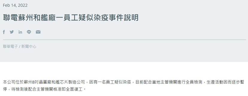 FX168财经报社(香港)讯 周一(2月14日),晶圆代工大厂联电(联华电子)对外发布公告,旗下位于苏州的8英寸晶圆厂——和舰芯片制造(苏州)股份有限公司有1名员工疑似染疫。目前和舰已配合当地主管机关进行全员检测,生产活动因而逐步暂停。