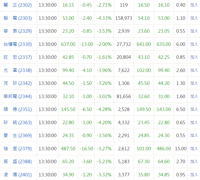 台湾半导体行业走势图(台股涨幅为红色,跌幅为绿色)