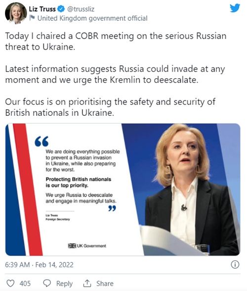 特拉斯在政府危机应对委员会(COBR)会议后在推特上说:“最新信息表明,俄罗斯可能随时入侵,我们敦促克里姆林宫缓和局势。”