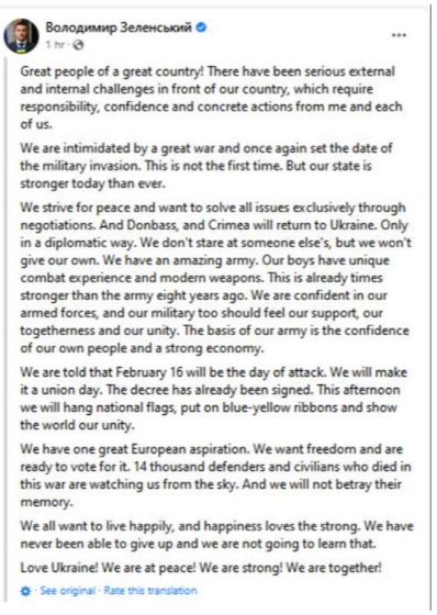 周一,泽伦斯基在Facebook上发表的一份书面声明中说:“我们被告知,2月16日将是袭击的日子。”他没有说明这一信息的来源,《纽约时报》曾在上周报道称,美国官员已经获悉,俄罗斯正在考虑将本周三作为可能开始军事行动的日期。