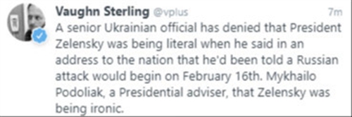 在泽伦斯基发表声明后的不久,乌克兰总统顾问波多利亚克向CNN澄清,泽伦斯基的言论意在“讽刺”。