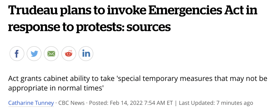 特鲁多将援引从未使用过的加拿大《紧急情况法》,赋予联邦政府额外的权力来处理反疫苗授权的抗议活动。这是加拿大历史上的第一次!