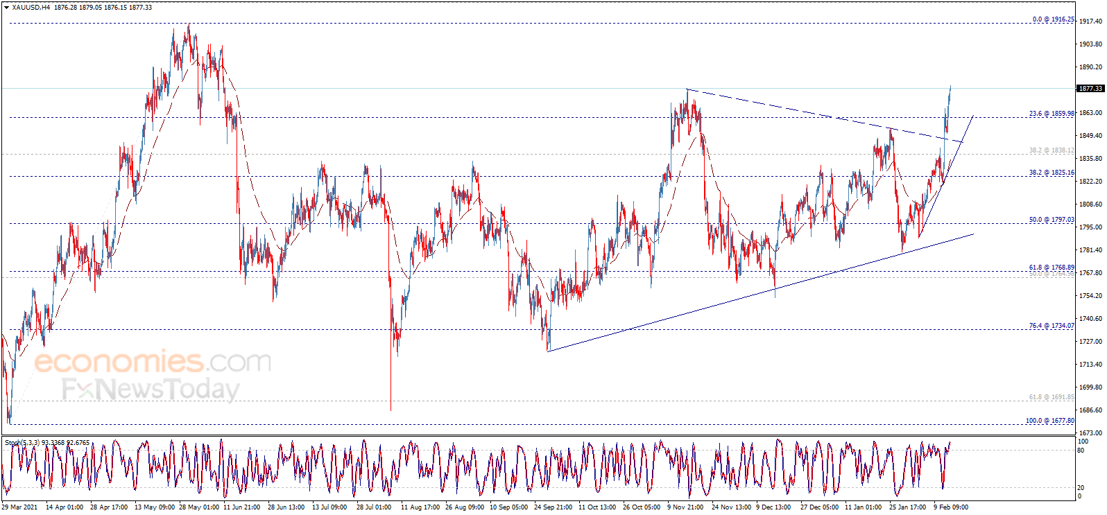 Economies.com称,从4小时图来看,EMA 50指标支持金价延续看涨走势。只要金价保持在1860.00美元/盎司上方,那么看涨情景仍然有效。