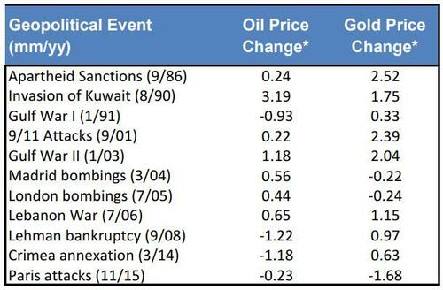 “在之前的研究中,我们发现,黄金价格对地缘政治冲击的反应存在巨大差异,9/11事件和2003年海湾战争后金价大幅上涨,而2014年克里米亚被吞并后金价几乎没有反应。我们看到的共同模式是,美国直接参与的地缘政治事件往往会对黄金产生更大的积极影响。