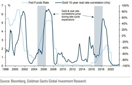 然而,高盛发现,从历史上看,黄金往往会在加息期间上涨,此时黄金与长期实际利率的负相关也往往会被打破。这种情况已经发生了,金价显示出对最近一次美国10年期实际利率上涨的弹性。在高盛之前的研究中,高盛认为,这与加息本身可能导致对经济增长放缓和衰退的担忧有关,从而提振对黄金等避险资产的需求。这意味着,如果通胀在2022年下半年未能放缓,美联储被迫提高利率,超过目前的预期,黄金应具有韧性,因为这将增加对潜在衰退的担忧。
