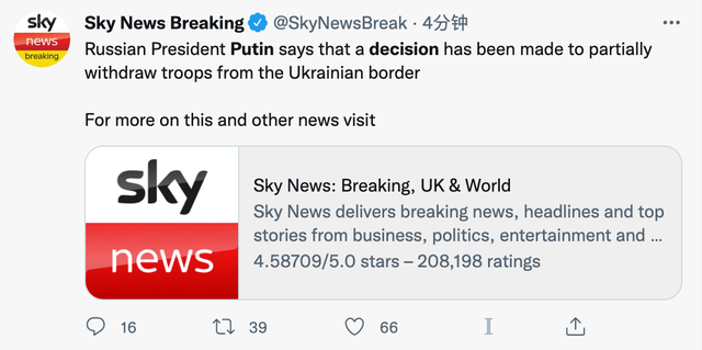 据报道,俄罗斯国防部表示,已经撤回了在乌克兰边境外集结的部分部队,尽管有人看到一些部队进入了备战状态。
