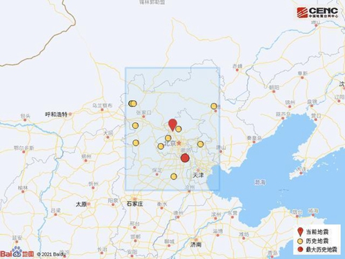 根据中国地震台网速报目录,震中周边200公里内近5年来发生3级以上地震共13次,最大地震是2018年2月12日在河北廊坊市永清县发生的4.3级地震(距离本次震中121公里),历史地震分布如图。