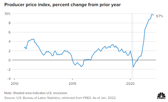 衡量批发通胀的生产者价格指数(PPI)1月份上升了1%,为道琼斯预期的两倍。PPI较上年同期飙升9.7%,仅略低于有记录以来的最大涨幅。最新的PPI是在1月份消费者价格指数(CPI)同比增长7.5%的几天后发布的,这进一步加大了美联储采取行动降温的压力。