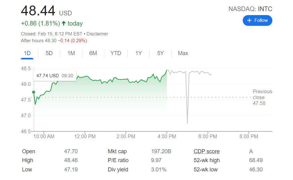 截至隔夜15日纽约收盘,英特尔股价上涨1.81%,收报48.44美元。
