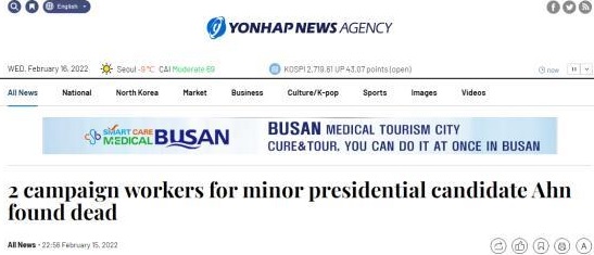 据韩联社报道,15日下午5时24分许,一名70多岁和一名50多岁的安哲秀拉票团成员,被发现死于停在忠清南道天安市东南区一条路上的竞选大巴内。安哲秀当日晚些时候前往安放两人遗体的天安市一家医院。