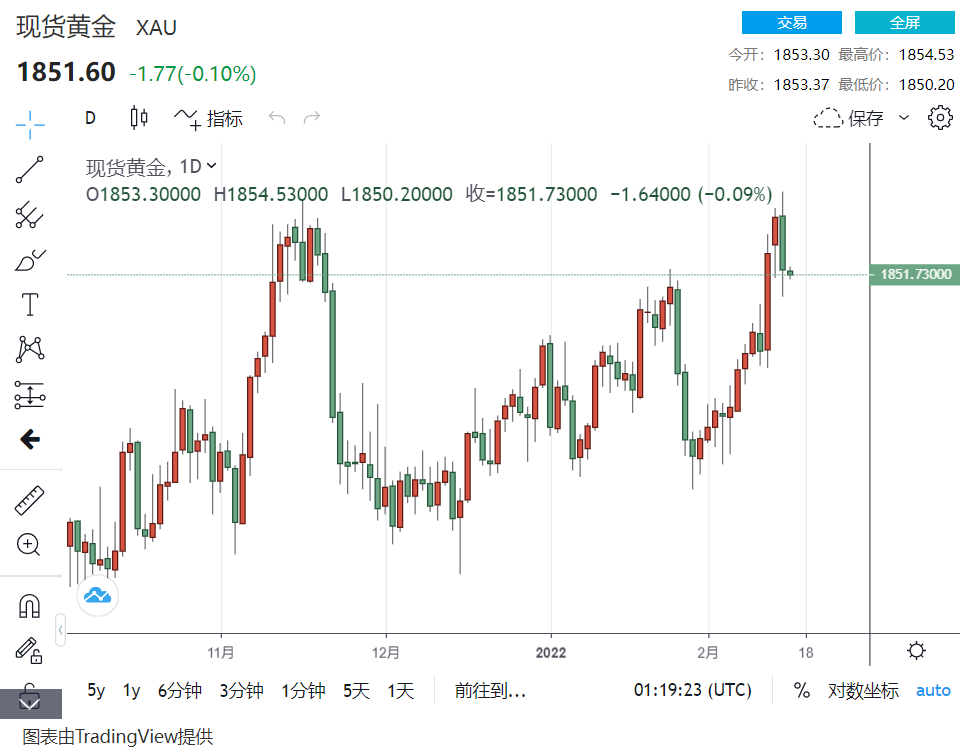 24K99讯 继美国传出16日俄军将开战后,英国媒体太阳报(The Sun)透露更具体的时间点,也就是16日亚市早盘9点。但如今时机已到,俄军不但隔夜撤军,而且未有发生如文章所提到的,先是以飞弹与轰炸机拉开战争帷幕。金价回撤近1850美元价位,油价跌破92.15,美元则显现反弹行情,报在96附近。