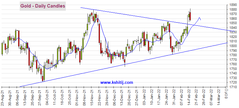 黄金方面,Kshitij咨询服务团队表示,黄金作为避险资产上涨,但在俄罗斯和乌克兰紧张局势缓和后回落。如果跌破短期支撑位1840美元/盎司,黄金期货将再次回到1840-1800美元/盎司。