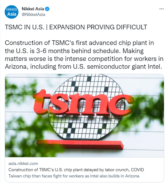 目前在美国除了台积电以外,三星与英特尔都在建设新的半导体厂。英特尔预计投入200亿美元扩大亚利桑那的生产基地,该基地距离台积电厂仅仅只有50公里。英特尔在该处雇用12000名员工,预计再扩编3000名员工。两大半导体厂在同一处地方大兴土木也让当地劳工紧缺。