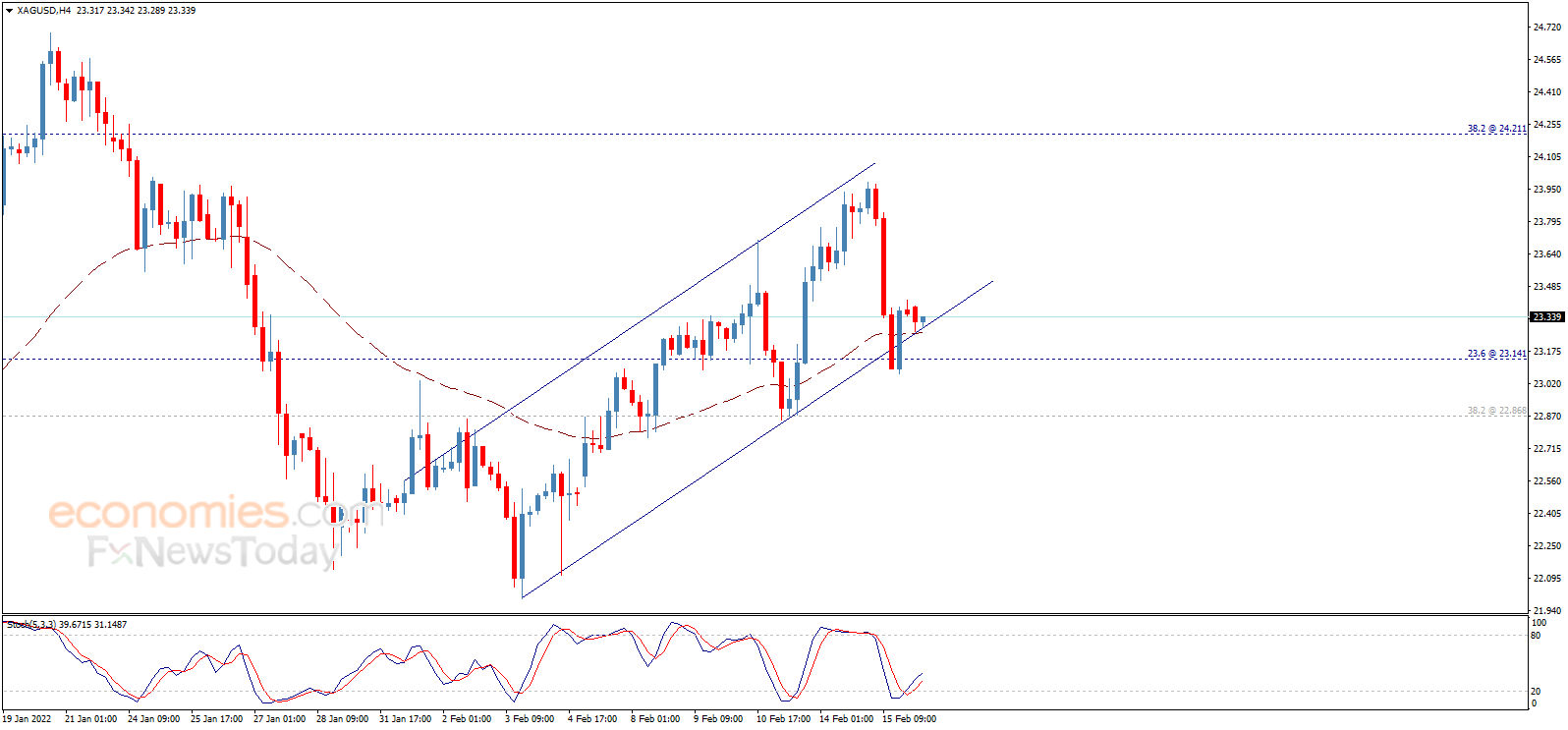 Economies.com表示,因此,我们预计银价在未来几个交易日上涨。从4小时图来看,EMA 50指标和随机指标构成支撑。只要银价保持在23.15美元/盎司上方,那么看涨预期仍将有效。