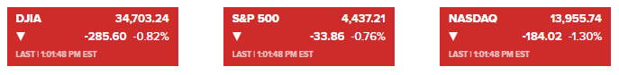 道琼斯指数下跌约300点或0.9%,标准普尔500指数下跌0.8%,纳斯达克综合指数下跌1.3%。