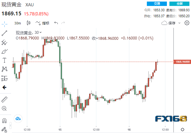 美市盘中,现货金扩大涨势,刷新日高至1869.93美元,较日低拉升了近20美元。