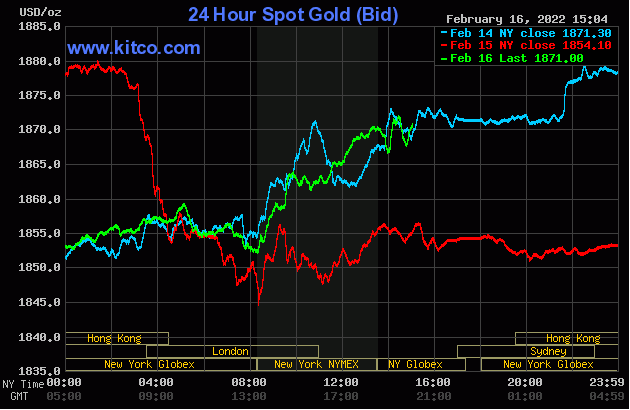 24K99讯 周三(2月16日)美市盘中,黄金价格强势上涨,看涨的逢低买盘者在早盘走软时加紧买入。外部市场利好黄金,原油大幅上涨,而美元指数走低。4月期金升14.60美元,报1871.00美元;3月纽约商品交易所期银升0.213美元,报23.555美元。