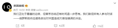 英国首相约翰逊通过“英国首相”账号发布一条中文微博:“我们正处于悬崖的边缘,但普京总统还有时间退一步思考。我们敦促所有人参与对话——俄罗斯政府应避免作出对本国造成灾难性错误的决定。”