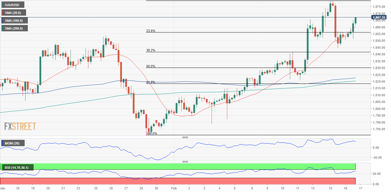 24K99讯 周四(2月17日)亚市早盘,现货黄金小幅上涨,目前交投在1871美元/盎司附近。知名财经网站FXStreet首席分析师Valeria Bednarik周四最新撰文,对金价技术前景进行分析。Bednarik指出,金价正在升向年内高点1879.48美元/盎司,并可能测试1900美元/盎司大关。
