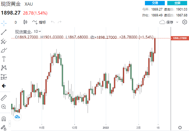 24K99讯 周四(2月17日),金价升至1900美元上方,为6月以来首见,因美国总统拜登表示,有充分迹象显示俄罗斯正计划入侵乌克兰,投资者纷纷买入安全的黄金。